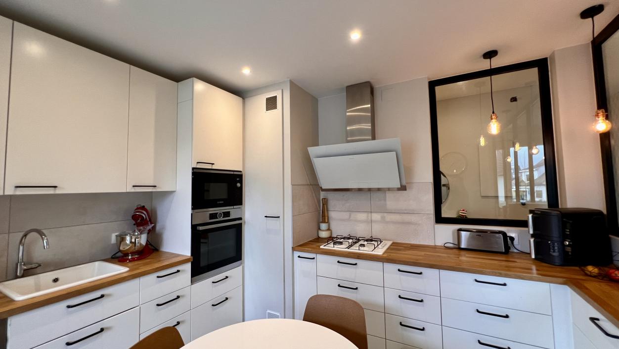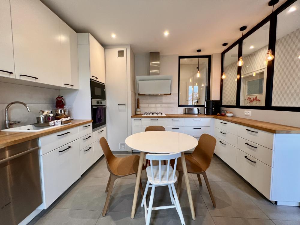 La cuisine indépendante, élégante et parfaitement équipée, est sublimée par une verrière contemporaine qui laisse circuler la lumière tout en structurant harmonieusement les volumes. Sa loggia constitue un véritable atout supplémentaire, apportant clarté et confort d’usage.