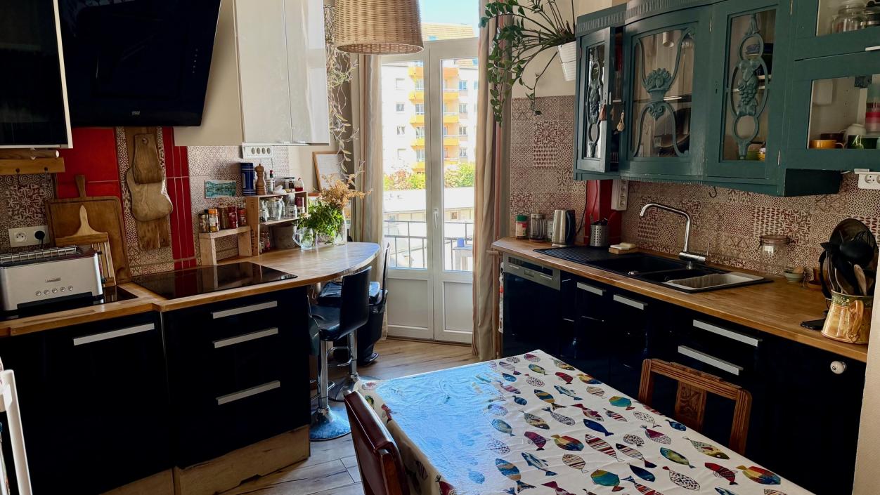 La cuisine équipée et aménagée bénéficie elle aussi d’un accès extérieur avec un second balcon orienté nord-est, offrant une double exposition qui garantit une clarté naturelle du matin au soir.