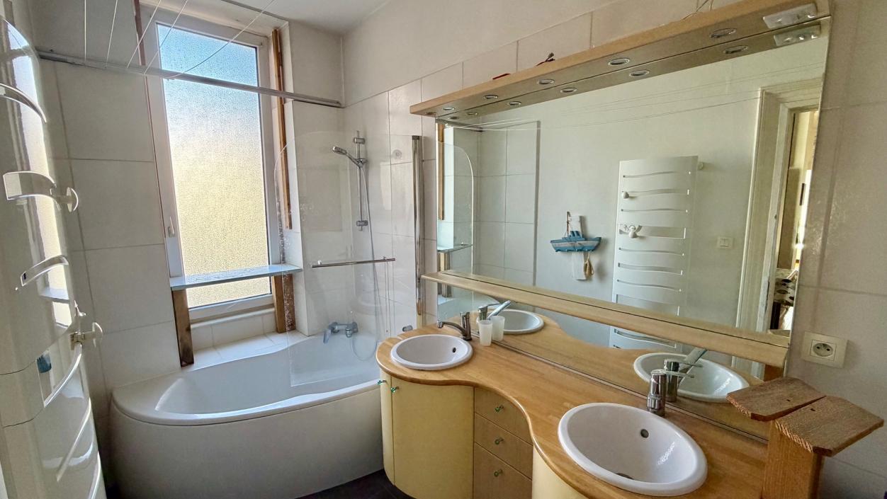 Il se compose d'une pièce de vie spacieuse et baignée de lumière, ouverte sur un balcon exposé sud-ouest, de trois chambres à coucher confortables avec une belle hauteur sous plafond, parquet et double vitrage récent, d'une salle de bains avec fenêtre et meuble double vasque et d'un WC séparé.