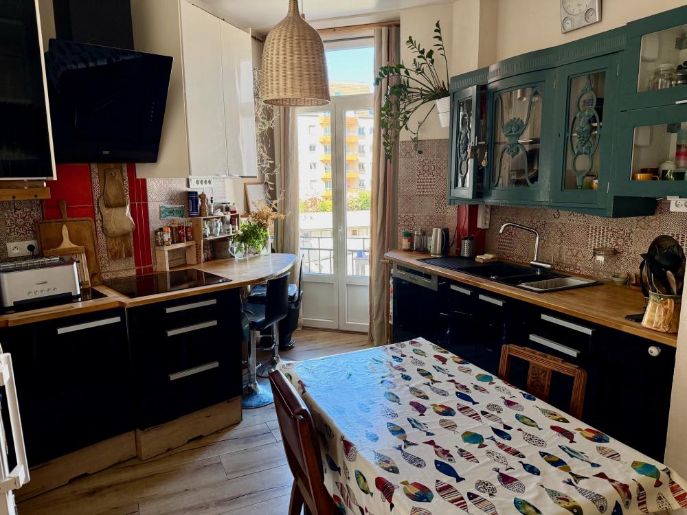 La cuisine équipée et aménagée bénéficie elle aussi d’un accès extérieur avec un second balcon orienté nord-est, offrant une double exposition qui garantit une clarté naturelle du matin au soir.