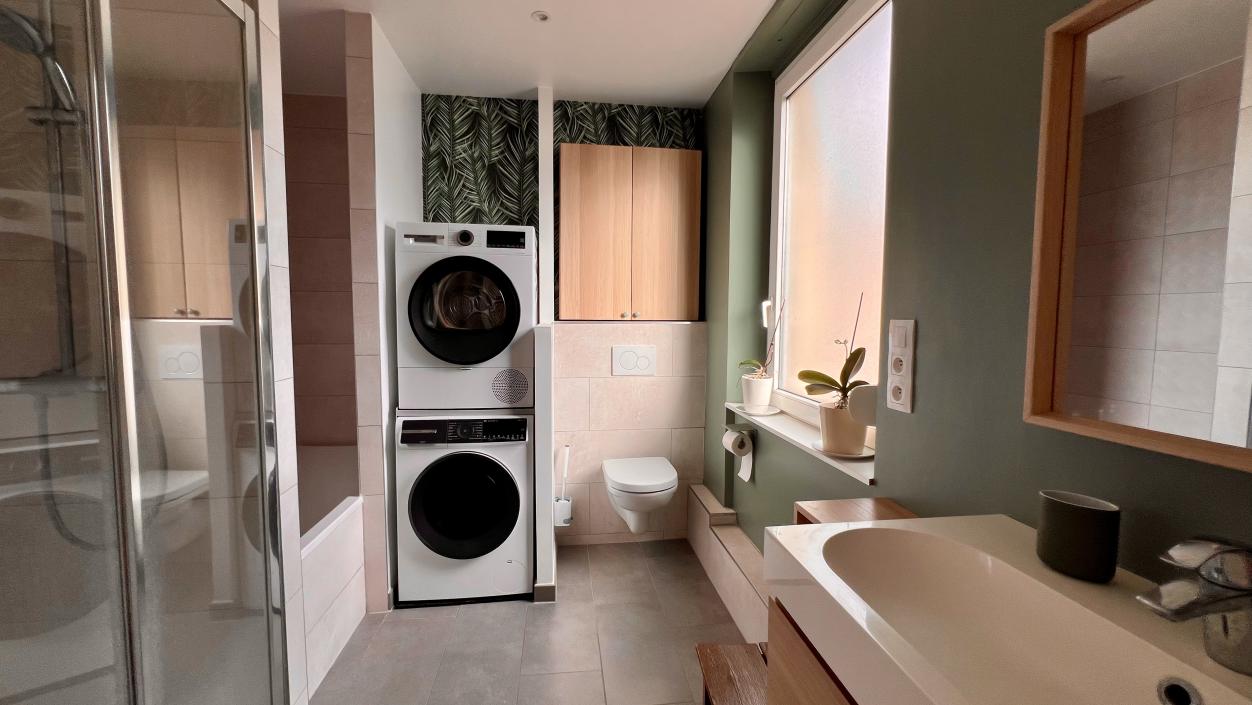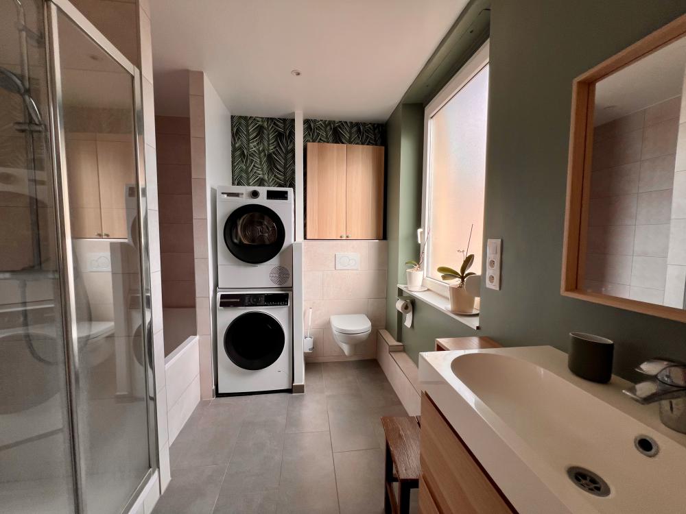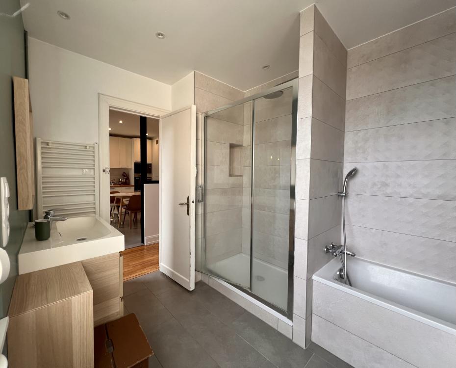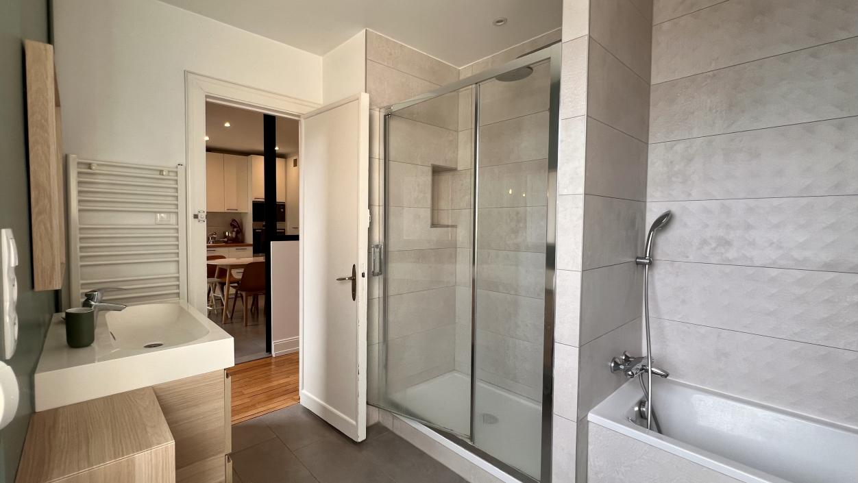 La grande salle de bains lumineuse est un véritable espace bien-être, équipée à la fois d’une douche et d’une baignoire pour s’adapter à tous les rythmes de vie, avec toilettes intégrées.