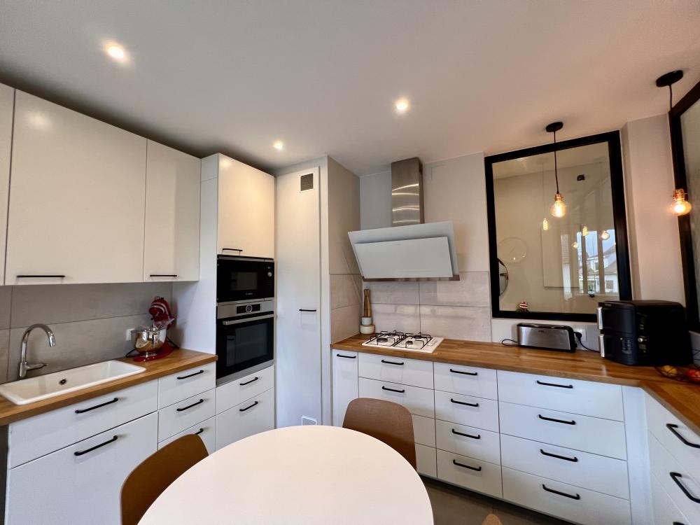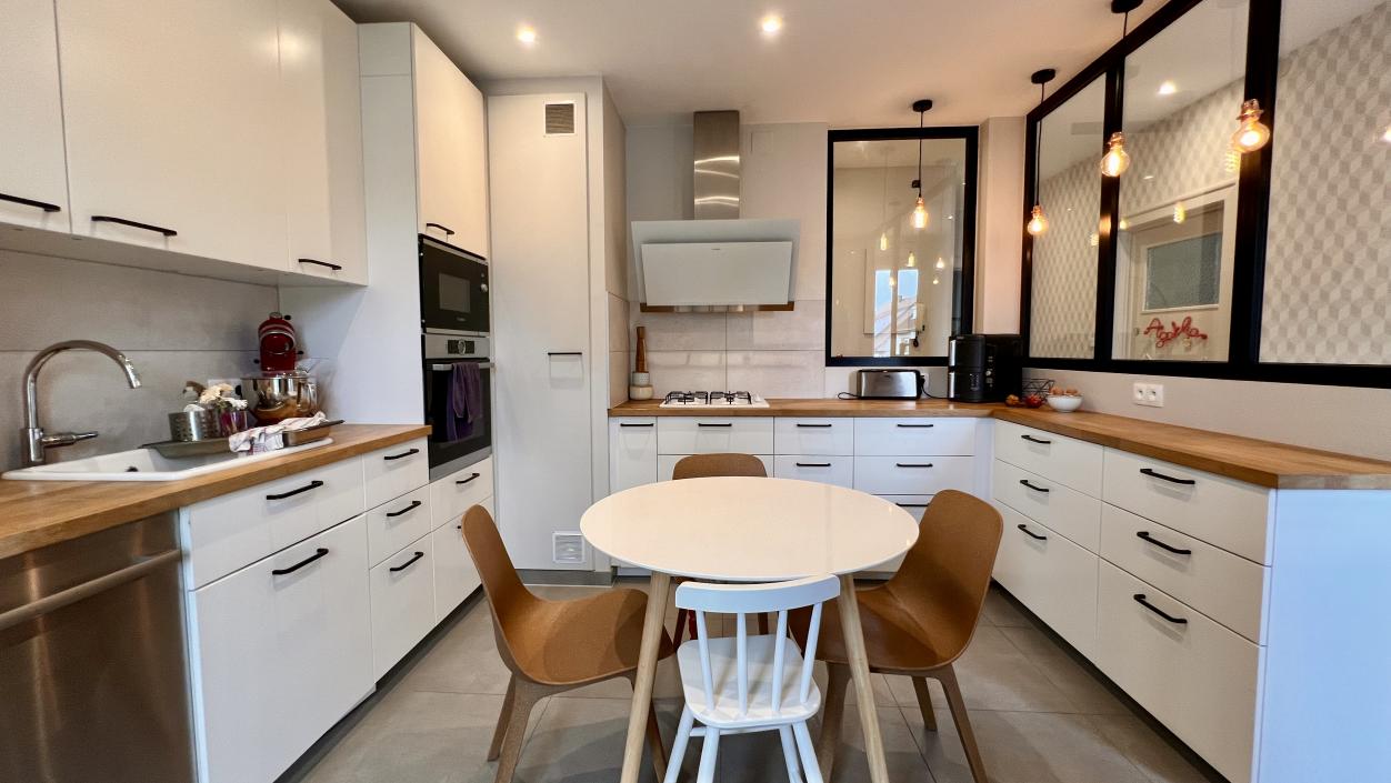 La cuisine indépendante, élégante et parfaitement équipée, est sublimée par une verrière contemporaine qui laisse circuler la lumière tout en structurant harmonieusement les volumes. Sa loggia constitue un véritable atout supplémentaire, apportant clarté et confort d’usage.